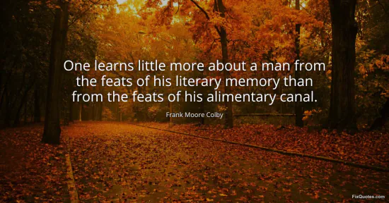 Colby, Frank Moore. (2026, January 15). One learns little more about a man from the feats of his literary memory than from the feats of his alimentary canal. FixQuotes. https://fixquotes.com/quotes/one-learns-little-more-about-a-man-from-the-feats-145745/
