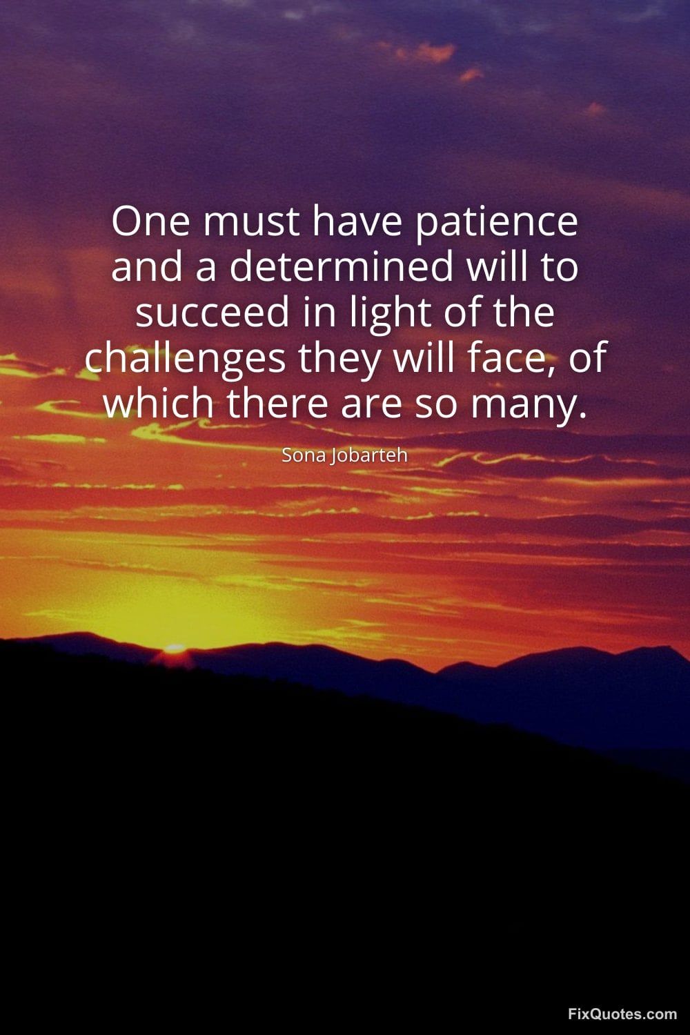 Jobarteh, Sona. "One must have patience and a determined will to succeed in light of the challenges one will face, of which there are so many." FixQuotes. February 16, 2026. https://fixquotes.com/quotes/one-must-have-patience-and-a-determined-will-to-185511/.