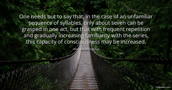 Ebbinghaus, Hermann. "One needs but to say that, in the case of an unfamiliar sequence of syllables, only about seven can be grasped in one act, but that with frequent repetition and gradually increasing familiarity with the series, this capacity of consciousness may be increased." FixQuotes. February 18, 2026. https://fixquotes.com/quotes/one-needs-but-to-say-that-in-the-case-of-an-77941/.