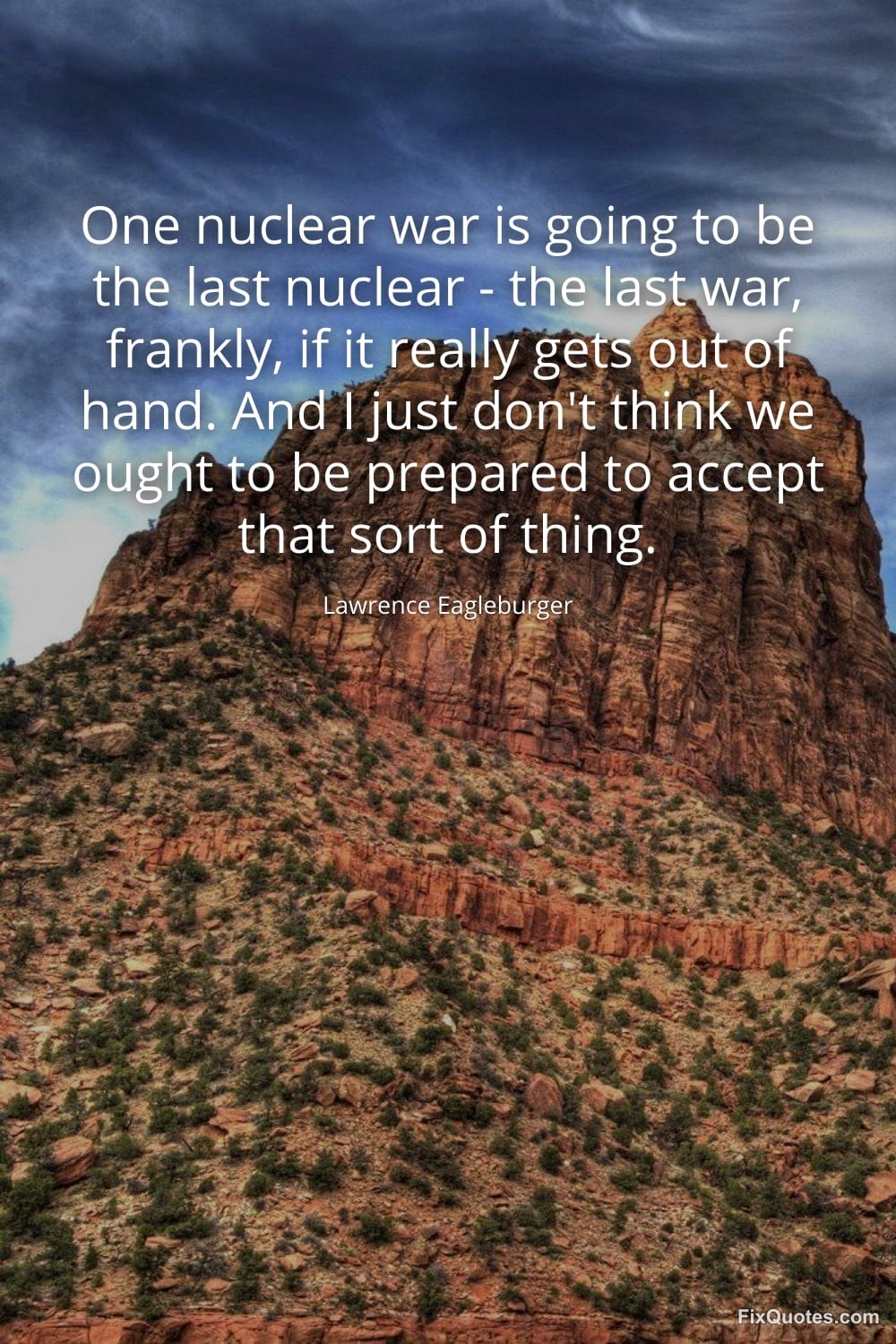 Eagleburger, Lawrence. (2026, January 18). One nuclear war is going to be the last nuclear - the last war, frankly, if it really gets out of hand. And I just don't think we ought to be prepared to accept that sort of thing. FixQuotes. https://fixquotes.com/quotes/one-nuclear-war-is-going-to-be-the-last-nuclear-6002/