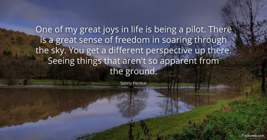 Perdue, Sonny. (2026, January 16). One of my great joys in life is being a pilot. There is a great sense of freedom in soaring through the sky. You get a different perspective up there. Seeing things that aren't so apparent from the ground. FixQuotes. https://fixquotes.com/quotes/one-of-my-great-joys-in-life-is-being-a-pilot-94865/