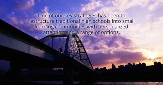 "One of our key strategies has been to restructure traditional high schools into small learning communities with personalized attention and a range of options." FixQuotes, 16 Jan. 2026, https://fixquotes.com/quotes/one-of-our-key-strategies-has-been-to-restructure-92227/. Accessed 13 Feb. 2026.