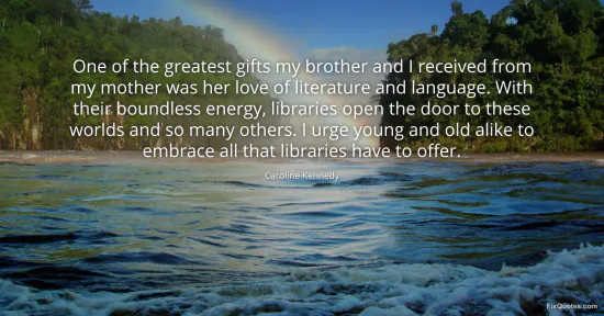 Kennedy, Caroline. (2026, January 15). One of the greatest gifts my brother and I received from my mother was her love of literature and language. With their boundless energy, libraries open the door to these worlds and so many others. I urge young and old alike to embrace all that libraries have to offer. FixQuotes. https://fixquotes.com/quotes/one-of-the-greatest-gifts-my-brother-and-i-115363/