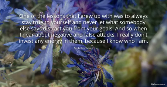 Obama, Michelle. "One of the lessons that I grew up with was to always stay true to yourself and never let what somebody else says distract you from your goals. And so when I hear about negative and false attacks, I really don't invest any energy in them, because I know who I am." FixQuotes. January 18, 2026. https://fixquotes.com/quotes/one-of-the-lessons-that-i-grew-up-with-was-to-17444/.
