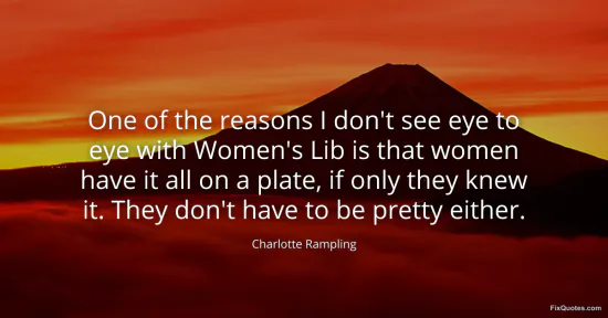 Rampling, Charlotte. (2026, February 16). One of the reasons I don't see eye to eye with Women's Lib is that women have it all on a plate, if only they knew it. They don't have to be pretty either. FixQuotes. https://fixquotes.com/quotes/one-of-the-reasons-i-dont-see-eye-to-eye-with-142108/