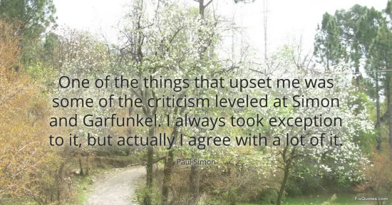 Simon, Paul. "One of the things that upset me was some of the criticism leveled at Simon and Garfunkel. I always took exception to it, but actually I agree with a lot of it." FixQuotes. January 16, 2026. https://fixquotes.com/quotes/one-of-the-things-that-upset-me-was-some-of-the-93815/.