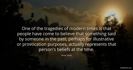 Shah, Idries. "One of the tragedies of modern times is that people have come to believe that something said by someone in the past, perhaps for illustrative or provocation purposes, actually represents that person's beliefs at the time." FixQuotes. January 16, 2026. https://fixquotes.com/quotes/one-of-the-tragedies-of-modern-times-is-that-122462/.