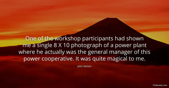 Sexton, John. "One of the workshop participants had shown me a single 8 X 10 photograph of a power plant where he actually was the general manager of this power cooperative. It was quite magical to me." FixQuotes. January 16, 2026. https://fixquotes.com/quotes/one-of-the-workshop-participants-had-shown-me-a-98315/.