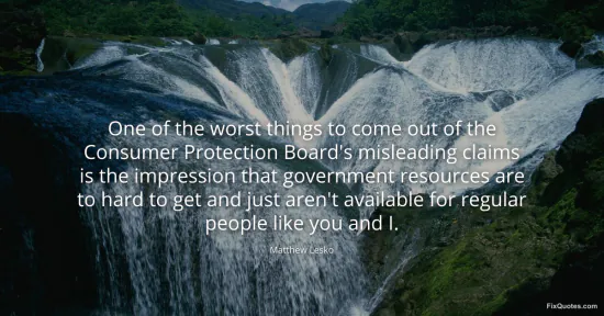 Lesko, Matthew. "One of the worst things to come out of the Consumer Protection Board's misleading claims is the impression that government resources are to hard to get and just aren't available for regular people like you and I." FixQuotes. January 15, 2026. https://fixquotes.com/quotes/one-of-the-worst-things-to-come-out-of-the-156777/.
