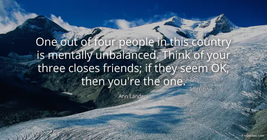Landers, Ann. "One out of four people in this country is mentally unbalanced. Think of your three closes friends; if they seem OK, then you're the one." FixQuotes. January 18, 2026. https://fixquotes.com/quotes/one-out-of-four-people-in-this-country-is-14284/.