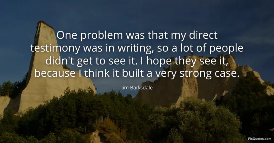 Barksdale, Jim. "One problem was that my direct testimony was in writing, so a lot of people didn't get to see it. I hope they see it, because I think it built a very strong case." FixQuotes. January 16, 2026. https://fixquotes.com/quotes/one-problem-was-that-my-direct-testimony-was-in-100565/.