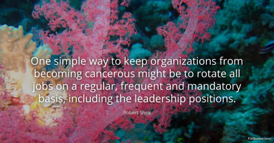 Shea, Robert. "One simple way to keep organizations from becoming cancerous might be to rotate all jobs on a regular, frequent and mandatory basis, including the leadership positions." FixQuotes. January 17, 2026. https://fixquotes.com/quotes/one-simple-way-to-keep-organizations-from-80893/.
