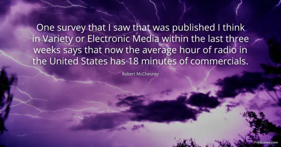 McChesney, Robert. "One survey that I saw that was published I think in Variety or Electronic Media within the last three weeks says that now the average hour of radio in the United States has 18 minutes of commercials." FixQuotes. January 16, 2026. https://fixquotes.com/quotes/one-survey-that-i-saw-that-was-published-i-think-83614/.
