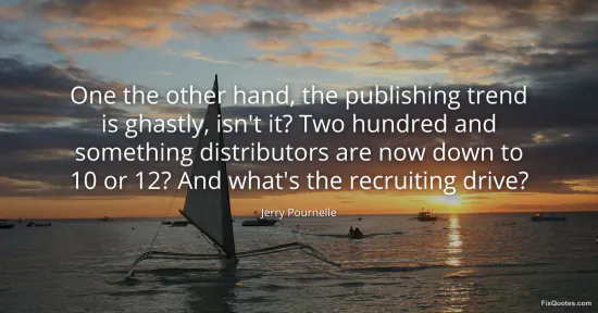 Pournelle, Jerry. (2026, January 16). One the other hand, the publishing trend is ghastly, isn't it? Two hundred and something distributors are now down to 10 or 12? And what's the recruiting drive? FixQuotes. https://fixquotes.com/quotes/one-the-other-hand-the-publishing-trend-is-91615/