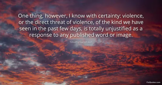 Ash, Timothy Garton. "One thing, however, I know with certainty: violence, or the direct threat of violence, of the kind we have seen in the past few days, is totally unjustified as a response to any published word or image." FixQuotes. January 16, 2026. https://fixquotes.com/quotes/one-thing-however-i-know-with-certainty-violence-107957/.