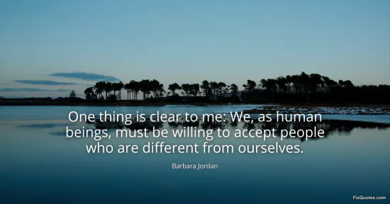 Jordan, Barbara. "One thing is clear to me: We, as human beings, must be willing to accept people who are different from ourselves." FixQuotes. January 17, 2026. https://fixquotes.com/quotes/one-thing-is-clear-to-me-we-as-human-beings-must-40744/.