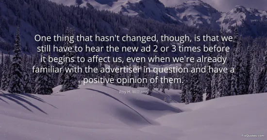 Williams, Roy H. "One thing that hasn't changed, though, is that we still have to hear the new ad 2 or 3 times before it begins to affect us, even when we're already familiar with the advertiser in question and have a positive opinion of them." FixQuotes. January 17, 2026. https://fixquotes.com/quotes/one-thing-that-hasnt-changed-though-is-that-we-65064/.