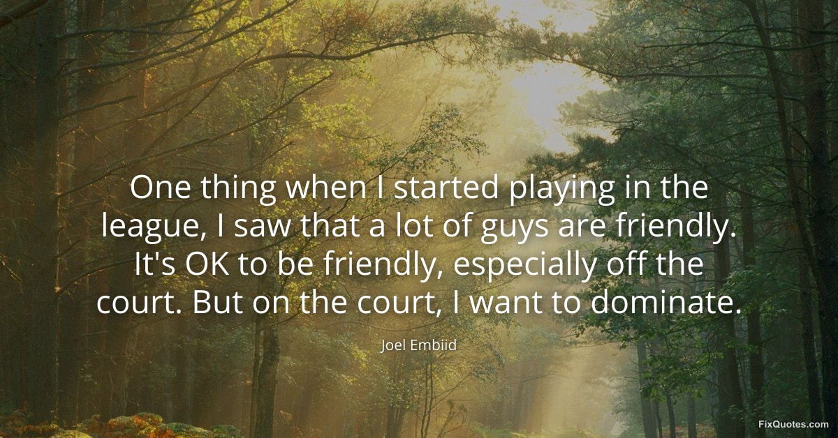 Embiid, Joel. (2026, January 30). One thing when I started playing in the league, I saw that a lot of guys are friendly. It's OK to be friendly, especially off the court. But on the court, I want to dominate. FixQuotes. https://fixquotes.com/quotes/one-thing-when-i-started-playing-in-the-league-i-184803/