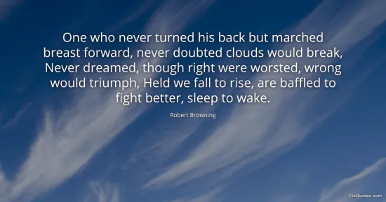Browning, Robert. "One who never turned his back but marched breast forward, never doubted clouds would break, Never dreamed, though right were worsted, wrong would triumph, Held we fall to rise, are baffled to fight better, sleep to wake." FixQuotes. January 18, 2026. https://fixquotes.com/quotes/one-who-never-turned-his-back-but-marched-breast-11566/.