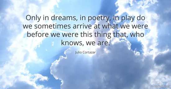 Cortazar, Julio. "Only in dreams, in poetry, in play do we sometimes arrive at what we were before we were this thing that, who knows, we are." FixQuotes. January 16, 2026. https://fixquotes.com/quotes/only-in-dreams-in-poetry-in-play-do-we-sometimes-84119/.
