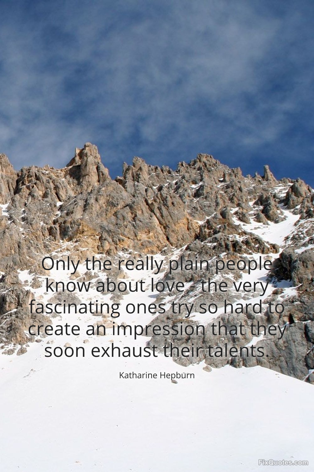 Hepburn, Katharine. (2026, January 17). Only the really plain people know about love - the very fascinating ones try so hard to create an impression that they soon exhaust their talents. FixQuotes. https://fixquotes.com/quotes/only-the-really-plain-people-know-about-love-28661/
