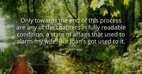 Saberhagen, Fred. (2026, January 17). Only towards the end of this process are any of the chapters in fully readable condition, a state of affairs that used to alarm my wife. But Joan's got used to it. FixQuotes. https://fixquotes.com/quotes/only-towards-the-end-of-this-process-are-any-of-66781/
