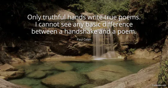 Celan, Paul. (2026, January 16). Only truthful hands write true poems. I cannot see any basic difference between a handshake and a poem. FixQuotes. https://fixquotes.com/quotes/only-truthful-hands-write-true-poems-i-cannot-see-136818/