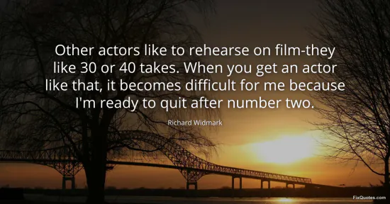 Widmark, Richard. "Other actors like to rehearse on film-they like 30 or 40 takes. When you get an actor like that, it becomes difficult for me because I'm ready to quit after number two." FixQuotes. January 16, 2026. https://fixquotes.com/quotes/other-actors-like-to-rehearse-on-film-they-like-85134/.