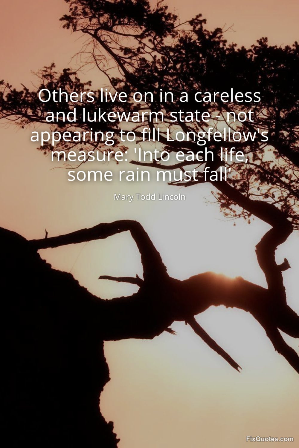 Lincoln, Mary Todd. (2026, February 16). Others live on in a careless and lukewarm state - not appearing to fill Longfellow's measure: 'Into each life, some rain must fall'. FixQuotes. https://fixquotes.com/quotes/others-live-on-in-a-careless-and-lukewarm-state-116711/
