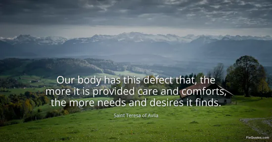 Avila, Saint Teresa of. "Our body has this defect that, the more it is provided care and comforts, the more needs and desires it finds." FixQuotes. January 18, 2026. https://fixquotes.com/quotes/our-body-has-this-defect-that-the-more-it-is-1654/.