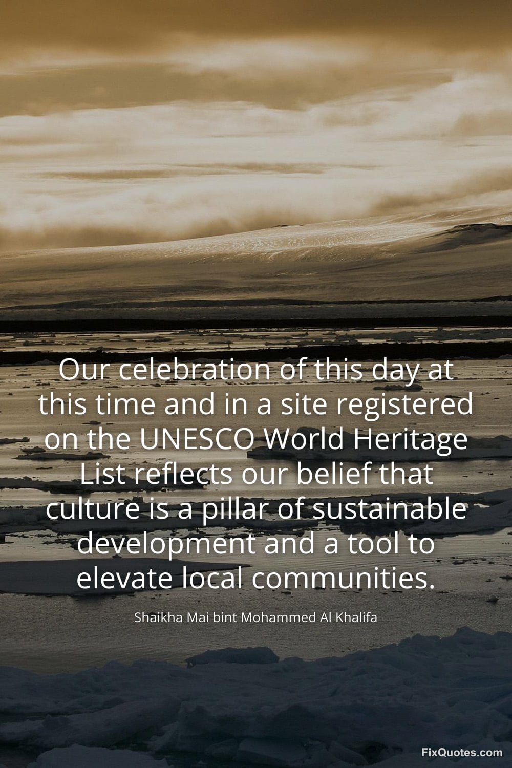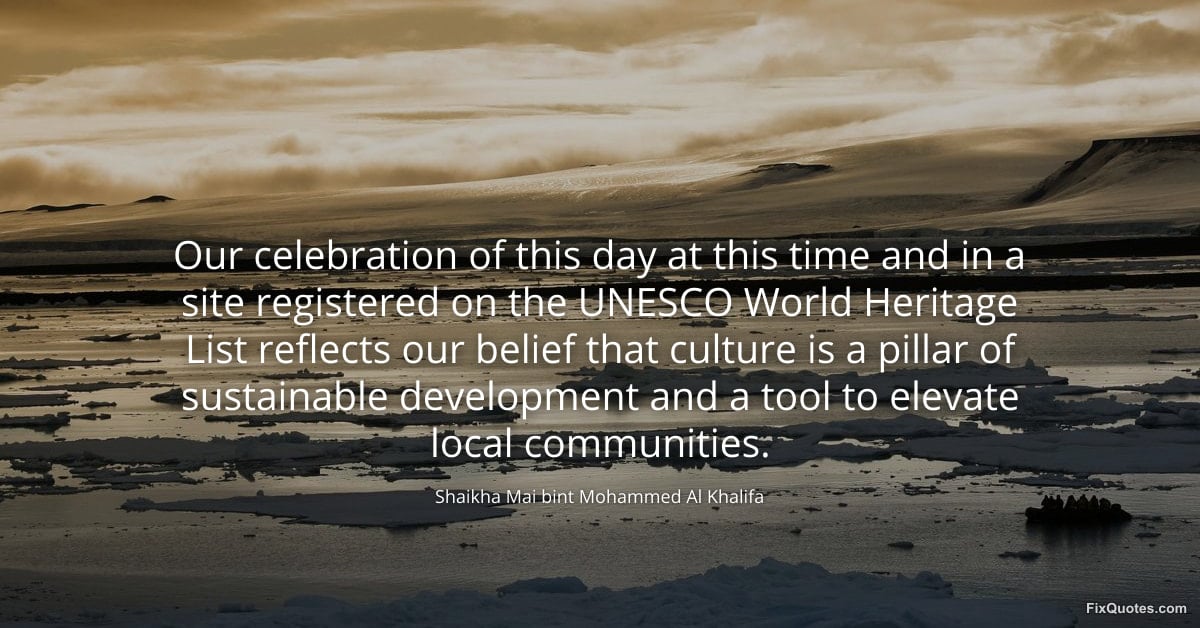 Khalifa, Shaikha Mai bint Mohammed Al. "Our celebration of this day at this time and in a site registered on the UNESCO World Heritage List reflects our belief that culture is a pillar of sustainable development and a tool to elevate local communities." FixQuotes. February 16, 2026. https://fixquotes.com/quotes/our-celebration-of-this-day-at-this-time-and-in-a-185480/.