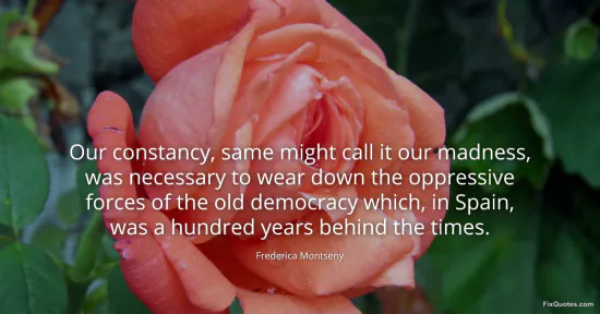 "Our constancy, same might call it our madness, was necessary to wear down the oppressive forces of the old democracy which, in Spain, was a hundred years behind the times." FixQuotes, 17 Jan. 2026, https://fixquotes.com/quotes/our-constancy-same-might-call-it-our-madness-was-55253/. Accessed 13 Feb. 2026.