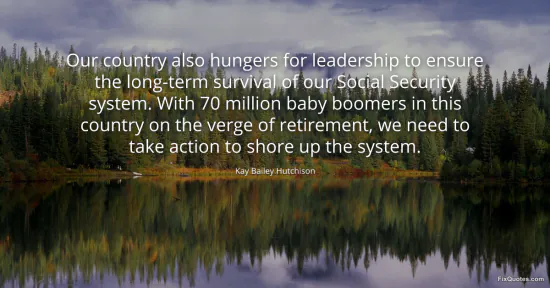 Hutchison, Kay Bailey. (2026, January 16). Our country also hungers for leadership to ensure the long-term survival of our Social Security system. With 70 million baby boomers in this country on the verge of retirement, we need to take action to shore up the system. FixQuotes. https://fixquotes.com/quotes/our-country-also-hungers-for-leadership-to-ensure-86496/