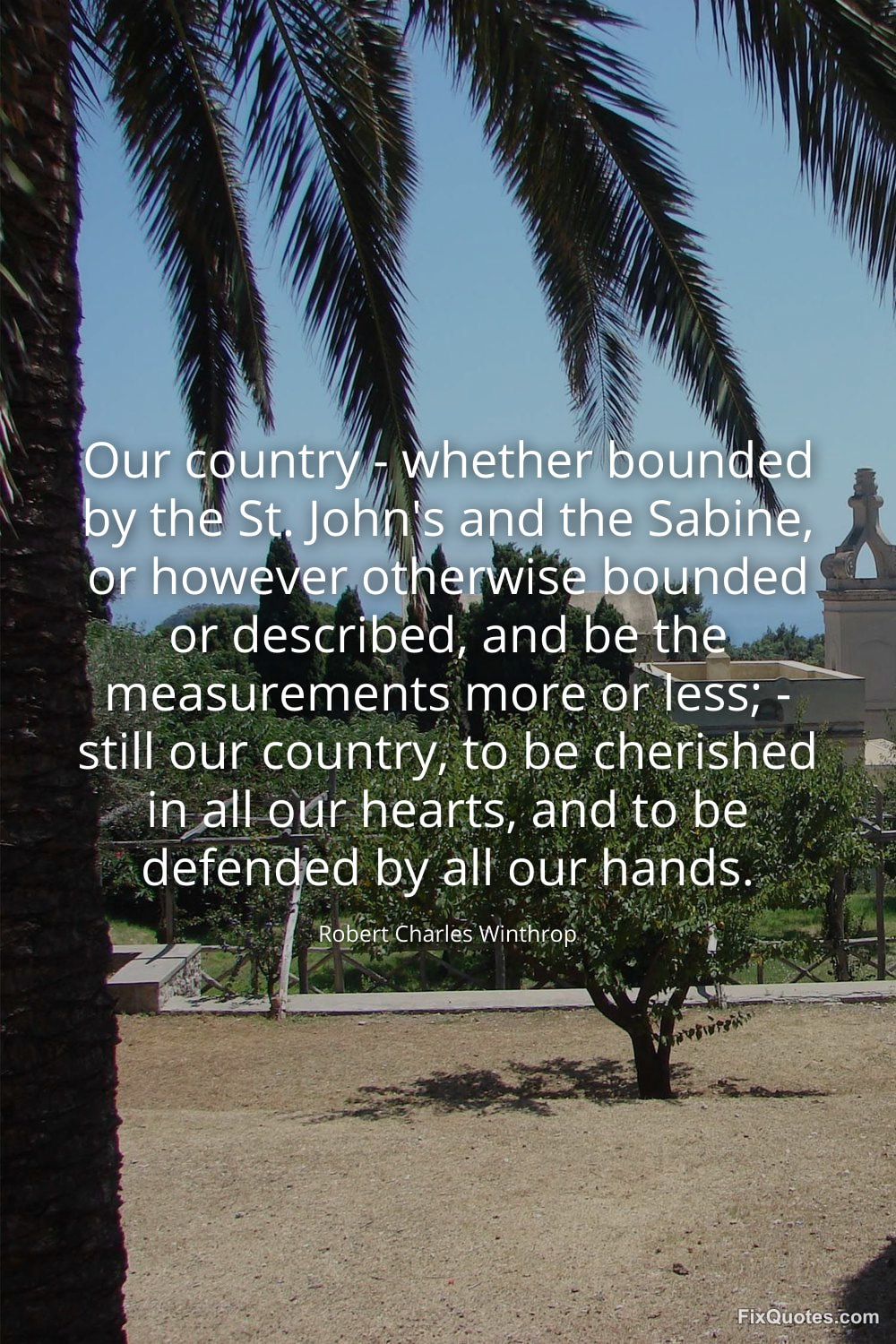 Winthrop, Robert Charles. "Our country - whether bounded by the St. John's and the Sabine, or however otherwise bounded or described, and be the measurements more or less; - still our country, to be cherished in all our hearts, and to be defended by all our hands." FixQuotes. January 15, 2026. https://fixquotes.com/quotes/our-country-whether-bounded-by-the-st-johns-and-164469/.
