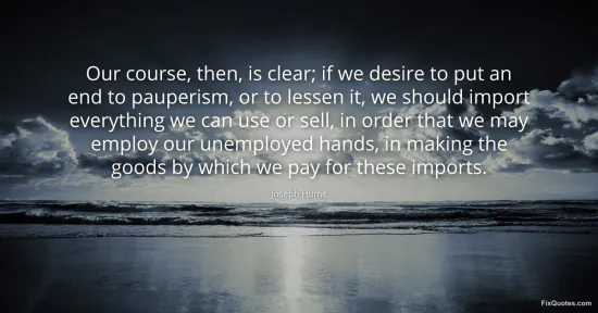 Hume, Joseph. "Our course, then, is clear; if we desire to put an end to pauperism, or to lessen it, we should import everything we can use or sell, in order that we may employ our unemployed hands, in making the goods by which we pay for these imports." FixQuotes. January 15, 2026. https://fixquotes.com/quotes/our-course-then-is-clear-if-we-desire-to-put-an-149832/.
