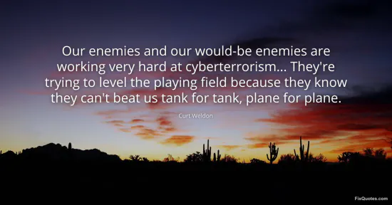 Weldon, Curt. "Our enemies and our would-be enemies are working very hard at cyberterrorism... They're trying to level the playing field because they know they can't beat us tank for tank, plane for plane." FixQuotes. January 17, 2026. https://fixquotes.com/quotes/our-enemies-and-our-would-be-enemies-are-working-67074/.