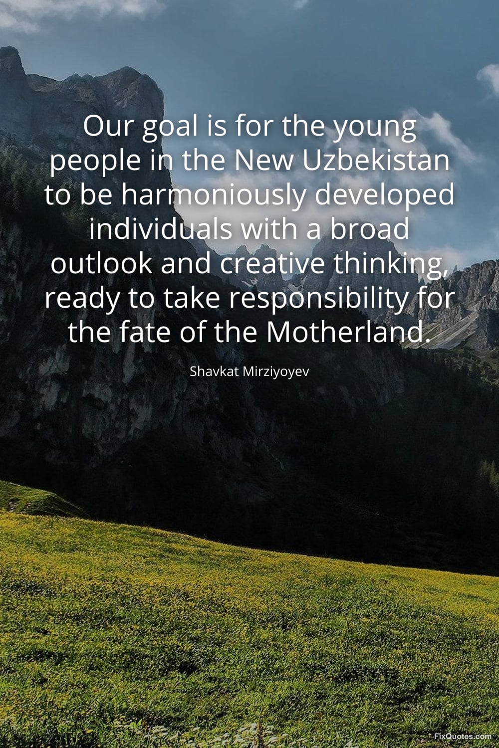 Mirziyoyev, Shavkat. "Our goal is for the young people in the New Uzbekistan to be harmoniously developed individuals with a broad outlook and creative thinking, ready to take responsibility for the fate of the Motherland." FixQuotes. March 7, 2026. https://fixquotes.com/quotes/our-goal-is-for-the-young-people-in-the-new-185716/.
