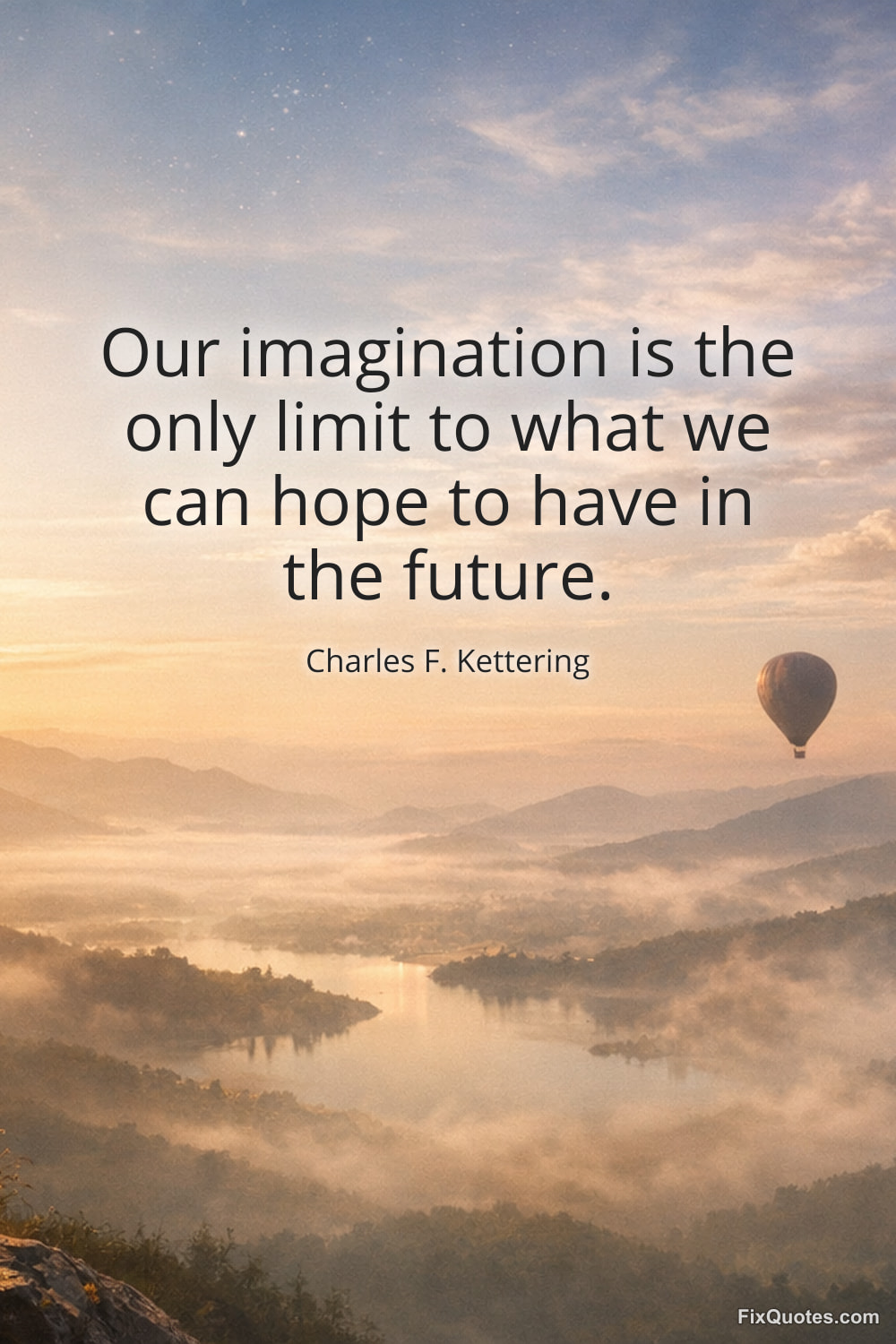 Kettering, Charles F. (2026, February 16). Our imagination is the only limit to what we can hope to have in the future. FixQuotes. https://fixquotes.com/quotes/our-imagination-is-the-only-limit-to-what-we-can-23004/