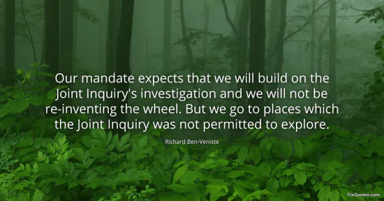 Ben-Veniste, Richard. (2026, January 17). Our mandate expects that we will build on the Joint Inquiry's investigation and we will not be re-inventing the wheel. But we go to places which the Joint Inquiry was not permitted to explore. FixQuotes. https://fixquotes.com/quotes/our-mandate-expects-that-we-will-build-on-the-76287/