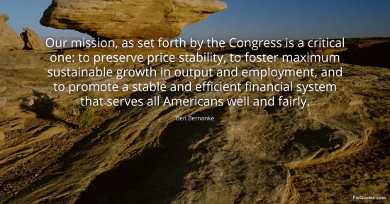Bernanke, Ben. "Our mission, as set forth by the Congress is a critical one: to preserve price stability, to foster maximum sustainable growth in output and employment, and to promote a stable and efficient financial system that serves all Americans well and fairly." FixQuotes. January 17, 2026. https://fixquotes.com/quotes/our-mission-as-set-forth-by-the-congress-is-a-36934/.