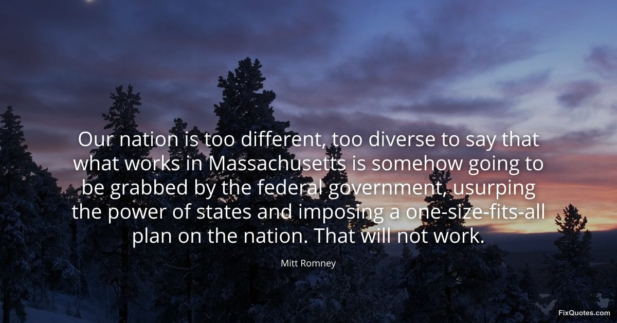 Romney, Mitt. (2026, January 17). Our nation is too different, too diverse to say that what works in Massachusetts is somehow going to be grabbed by the federal government, usurping the power of states and imposing a one-size-fits-all plan on the nation. That will not work. FixQuotes. https://fixquotes.com/quotes/our-nation-is-too-different-too-diverse-to-say-28146/