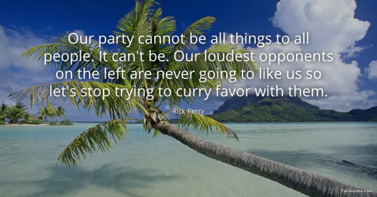 Perry, Rick. "Our party cannot be all things to all people. It can't be. Our loudest opponents on the left are never going to like us so let's stop trying to curry favor with them." FixQuotes. January 18, 2026. https://fixquotes.com/quotes/our-party-cannot-be-all-things-to-all-people-it-20695/.