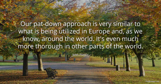 Pistole, John. "Our pat-down approach is very similar to what is being utilized in Europe and, as we know, around the world. It's even much more thorough in other parts of the world." FixQuotes. January 15, 2026. https://fixquotes.com/quotes/our-pat-down-approach-is-very-similar-to-what-is-158708/.