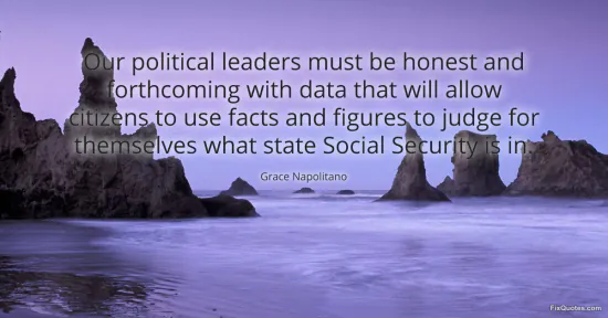 Napolitano, Grace. "Our political leaders must be honest and forthcoming with data that will allow citizens to use facts and figures to judge for themselves what state Social Security is in." FixQuotes. January 17, 2026. https://fixquotes.com/quotes/our-political-leaders-must-be-honest-and-67953/.