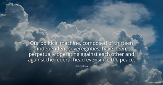 Knox, Henry. "Our political machine, composed of thirteen independent sovereignties, have been perpetually operating against each other and against the federal head ever since the peace." FixQuotes. January 18, 2026. https://fixquotes.com/quotes/our-political-machine-composed-of-thirteen-6564/.