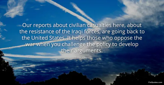 Arnett, Peter. "Our reports about civilian casualties here, about the resistance of the Iraqi forces, are going back to the United States. It helps those who oppose the war when you challenge the policy to develop their arguments." FixQuotes. January 16, 2026. https://fixquotes.com/quotes/our-reports-about-civilian-casualties-here-about-107259/.