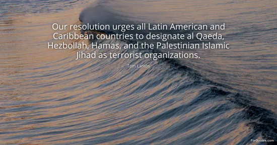 Lantos, Tom. "Our resolution urges all Latin American and Caribbean countries to designate al Qaeda, Hezbollah, Hamas, and the Palestinian Islamic Jihad as terrorist organizations." FixQuotes. January 18, 2026. https://fixquotes.com/quotes/our-resolution-urges-all-latin-american-and-12241/.