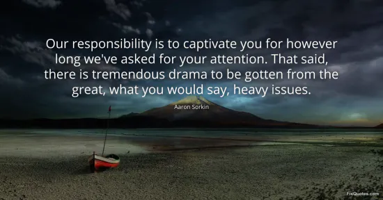Sorkin, Aaron. "Our responsibility is to captivate you for however long we've asked for your attention. That said, there is tremendous drama to be gotten from the great, what you would say, heavy issues." FixQuotes. January 17, 2026. https://fixquotes.com/quotes/our-responsibility-is-to-captivate-you-for-61443/.