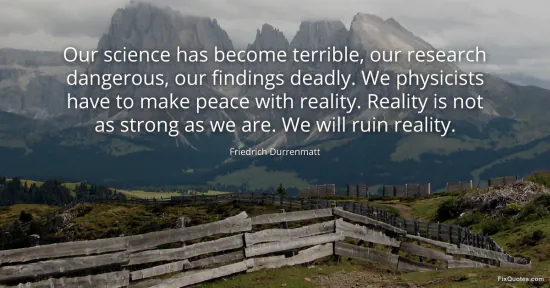 Durrenmatt, Friedrich. (2026, January 15). Our science has become terrible, our research dangerous, our findings deadly. We physicists have to make peace with reality. Reality is not as strong as we are. We will ruin reality. FixQuotes. https://fixquotes.com/quotes/our-science-has-become-terrible-our-research-54220/