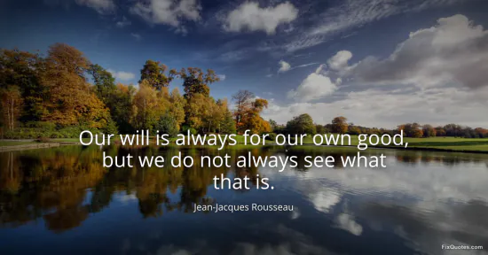 Rousseau, Jean-Jacques. (2026, January 17). Our will is always for our own good, but we do not always see what that is. FixQuotes. https://fixquotes.com/quotes/our-will-is-always-for-our-own-good-but-we-do-not-24332/